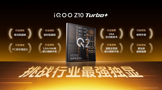 iQOO Z10 Turbo+ 搭载 iQOO 有史以来最强的自研电竞芯片 Q2,具备良好兼容性;支持 iQOO 旗下首款全场景直驱供电,双频 GPS、iQOO Z10 Turbo+ 支持 5.5G网络、并具备旗舰同款 NICE 2.0 算法,